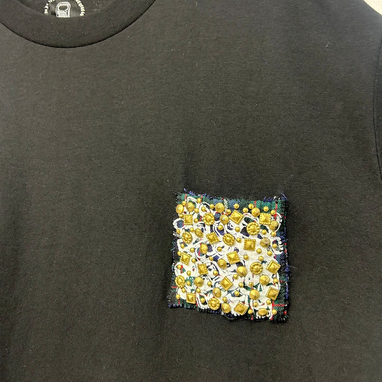 タータンチェックのポケットが付いたゆったりシルエットのTシャツです。ポケットには全て手作業で付けられたスタッズが迫力を醸し出しています。完全一点物のスペシャルTシャツです。